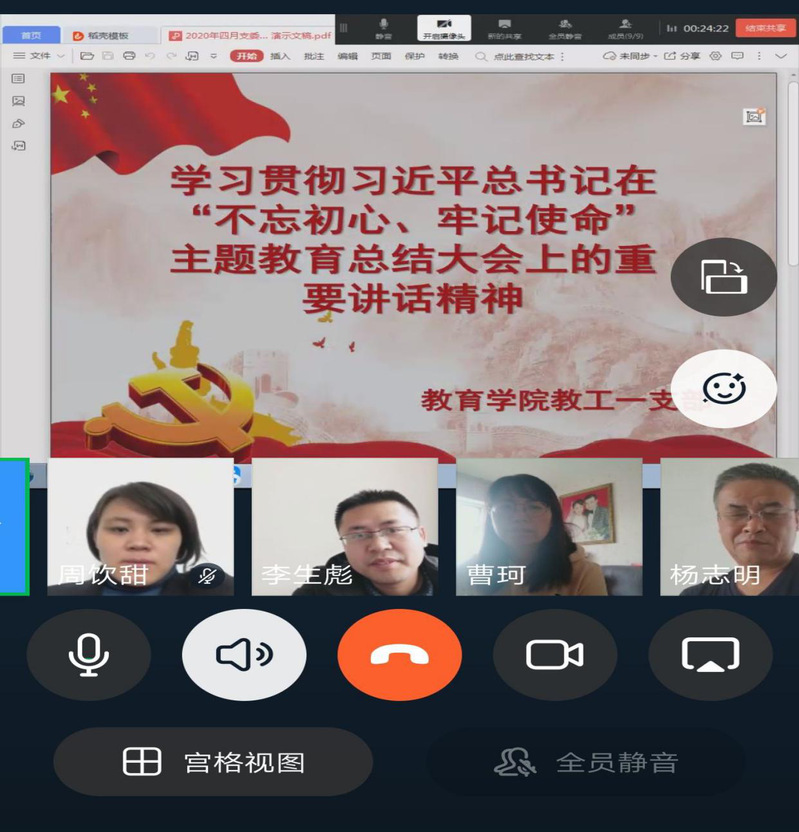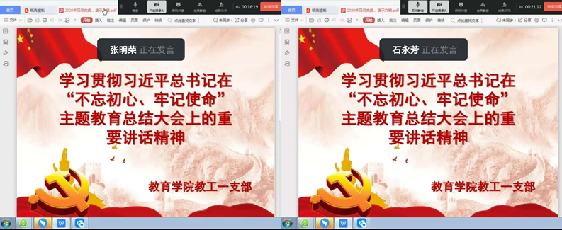 4月17日,金沙2004路线js5教工一支部通过钉钉视屏会议的形式开展了学习习近平总书记在“不忘初心,牢记使命”主题教育总结大会上的重要讲话的学习和专